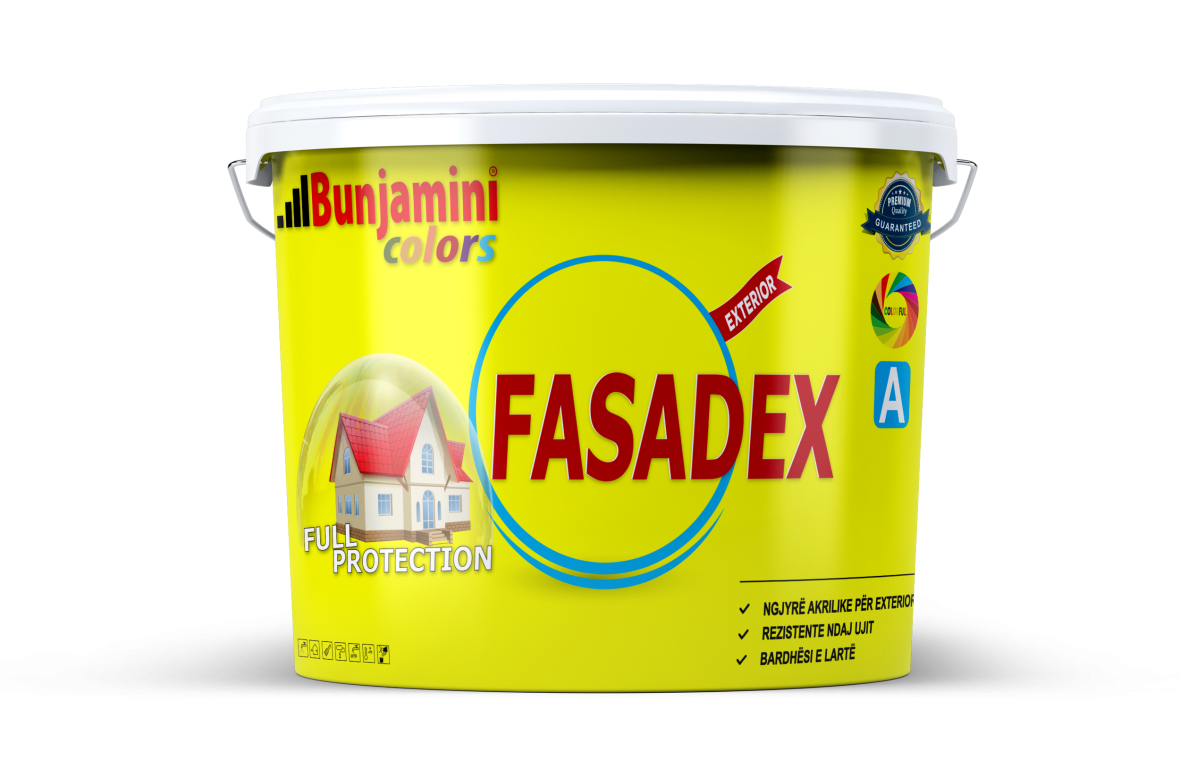 Fasadex është ngjyrë e lëngshme me cilësi të lartë për përdorim të jashtëm.Krijon një mbulim të bukur dhe të qëndrueshëm.Rezistente ndaj kushteve atmosferike (reshjeve, temperaturave të larta dhe të ulëta, si dhe rrezeve të diellit).Me aftësi difuzioni (lejon frymëmarrjen e sipërfaqes). Elastike. Ekologjike. Mundëson formulimin e një game të gjerë ngjyrash sipas dëshirës.